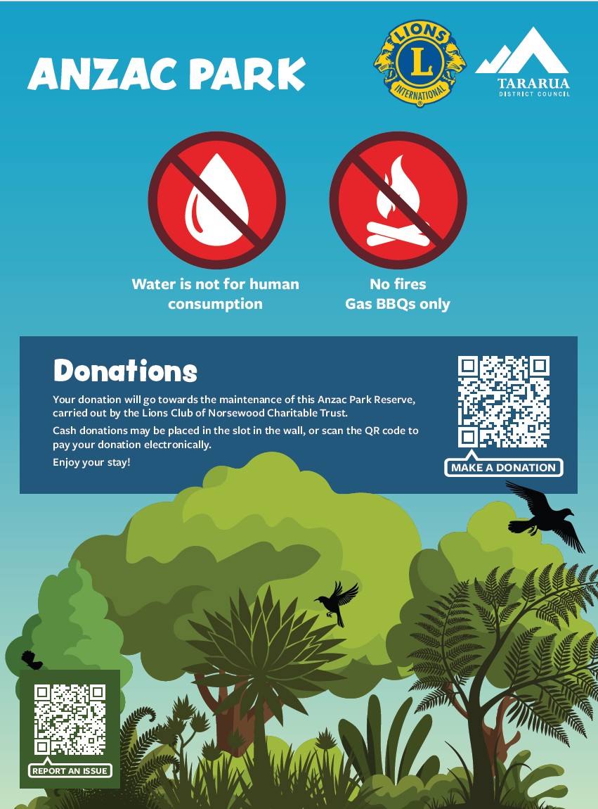 Large, secluded grass area surrounded by trees and bush. Your donation will go towards the maintenance of this Anzac Park Reserve, carried out by the Lions Club of Norsewood Charitable Trust.